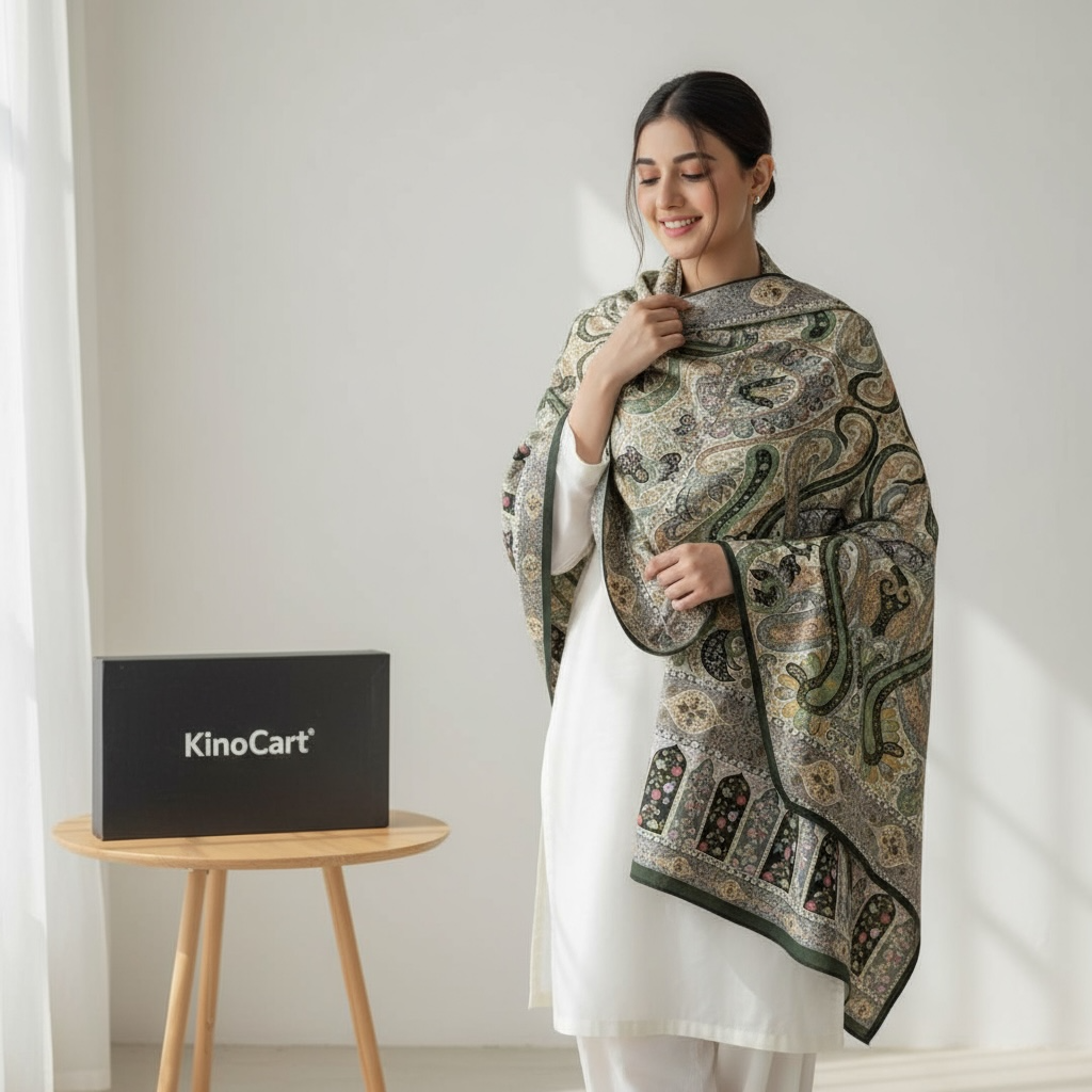 Experience the quiet luxury of timeless art with Kinocart’s Light Green Kalamkari Pashmina Shawl. Each piece is carefully handcrafted from fine imported pashmina, adorned with traditional Kalamkari patterns that speak of heritage and grace. The soft green tone adds a refreshing sophistication, perfect for winter gatherings or graceful daily wear.