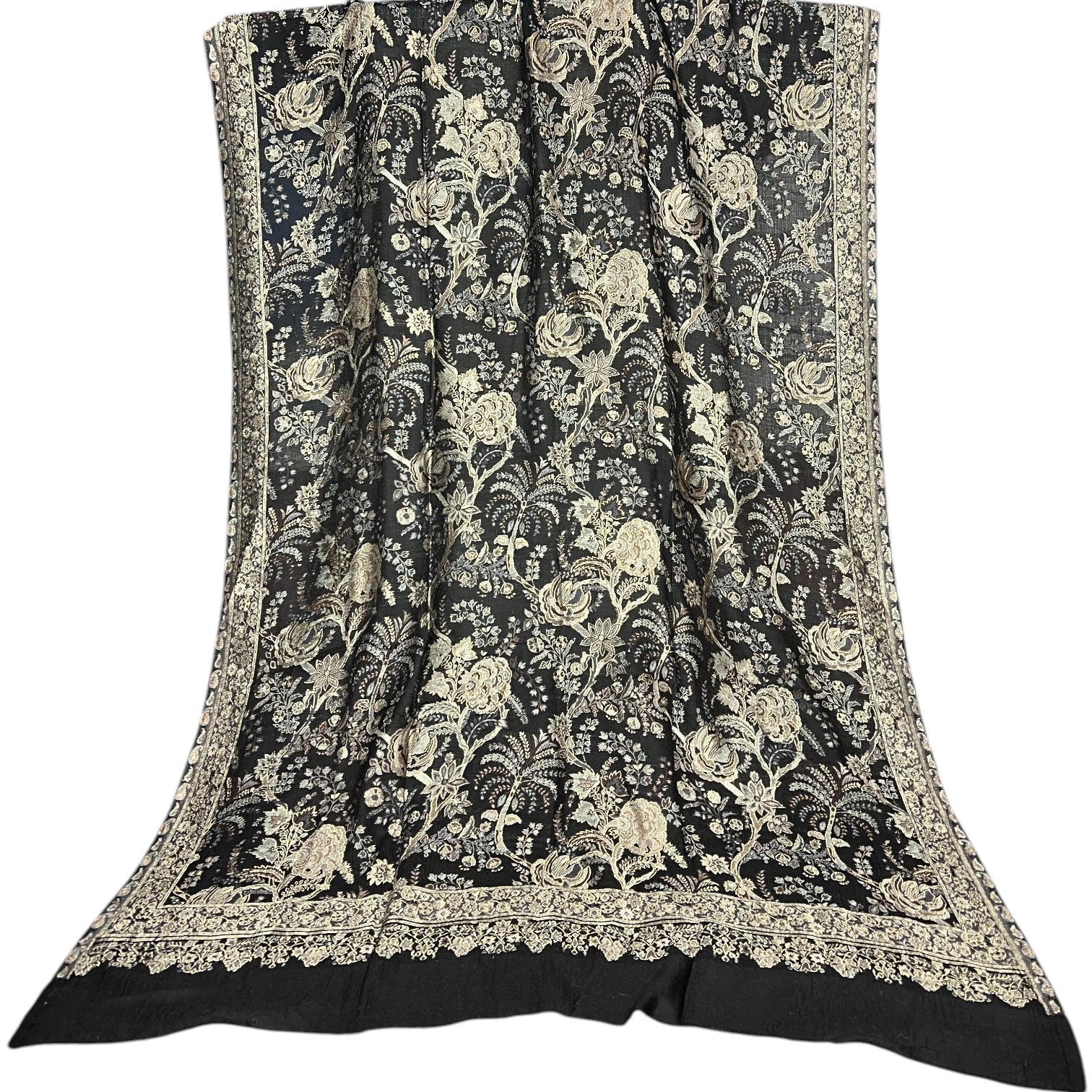 All-Over Jaal: The entire shawl is covered in a beautiful, dense floral and vine pattern (known as Jaal), characteristic of the most elaborate and traditional Kashmiri textiles.