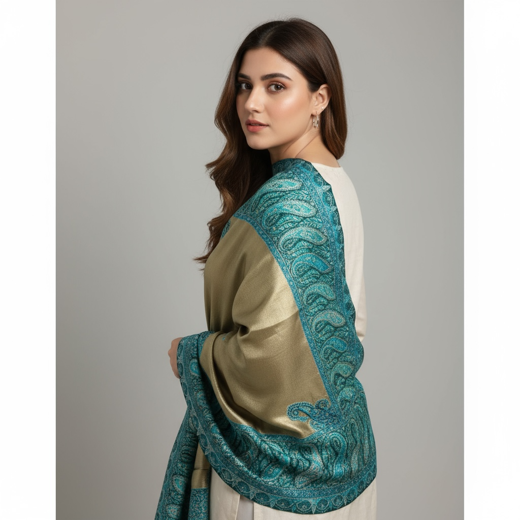 Shine with elegance in our Moonlight Pashmina Shawl, a luxurious blend of golden and sea green hues inspired by moonlit nights over Kashmir’s valleys. Handwoven by expert Kashmiri artisans, this shawl captures the perfect balance of warmth, softness, and radiant beauty — ideal for women who love refined luxury and sophisticated fashion.