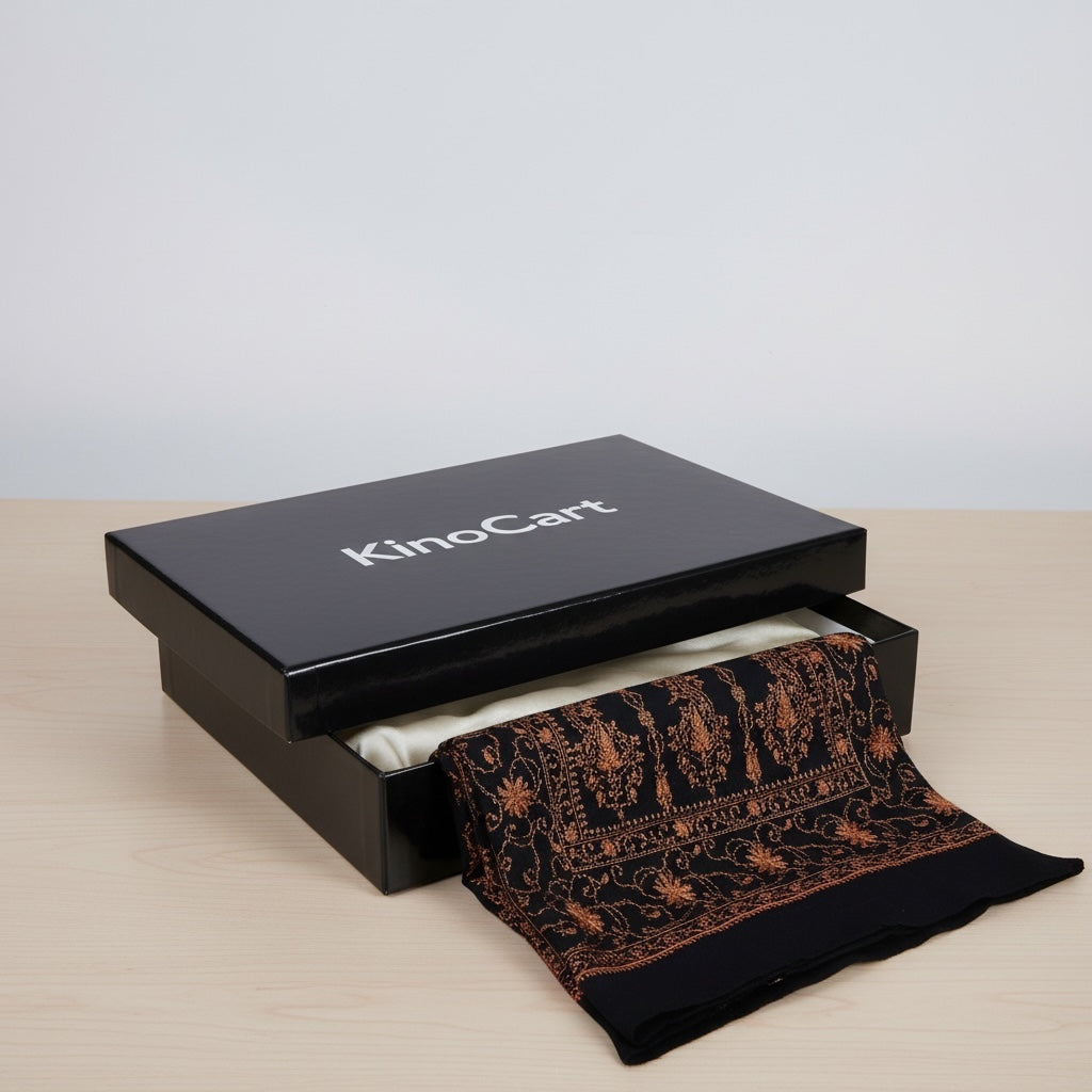 Experience the charm of intricate Kashmiri needlework and the luxurious warmth of Pashmina with this timeless black shawl, exclusively available at KinoCart.
