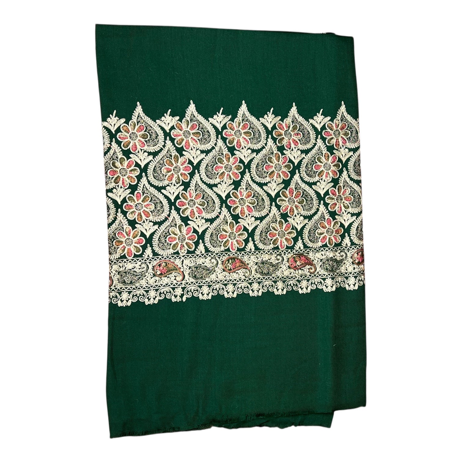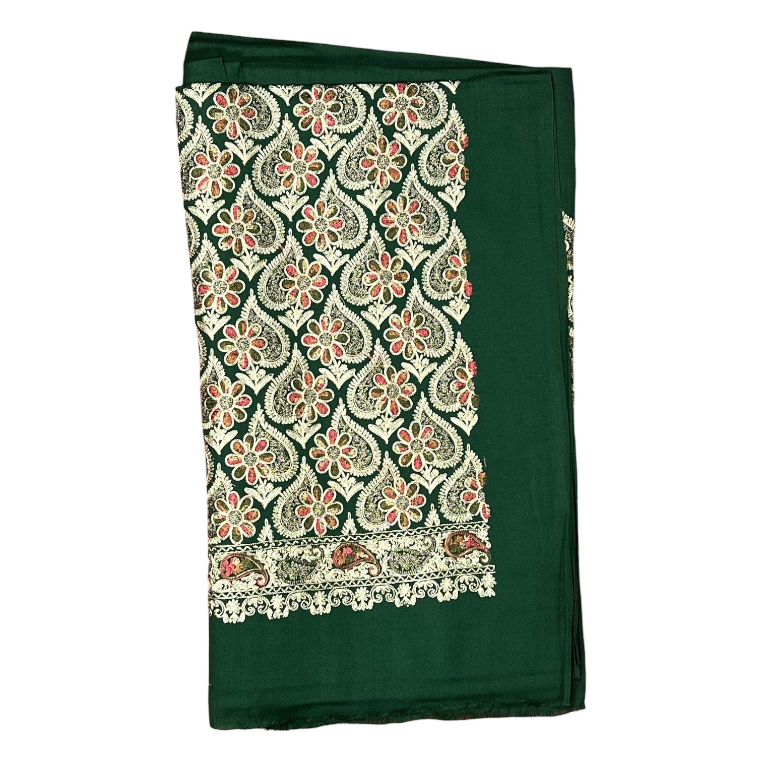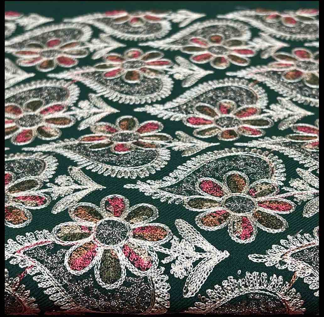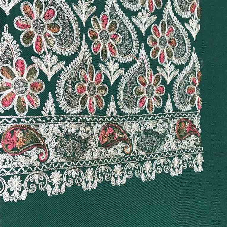 Rich green color with detailed Kashmiri-style embroidery