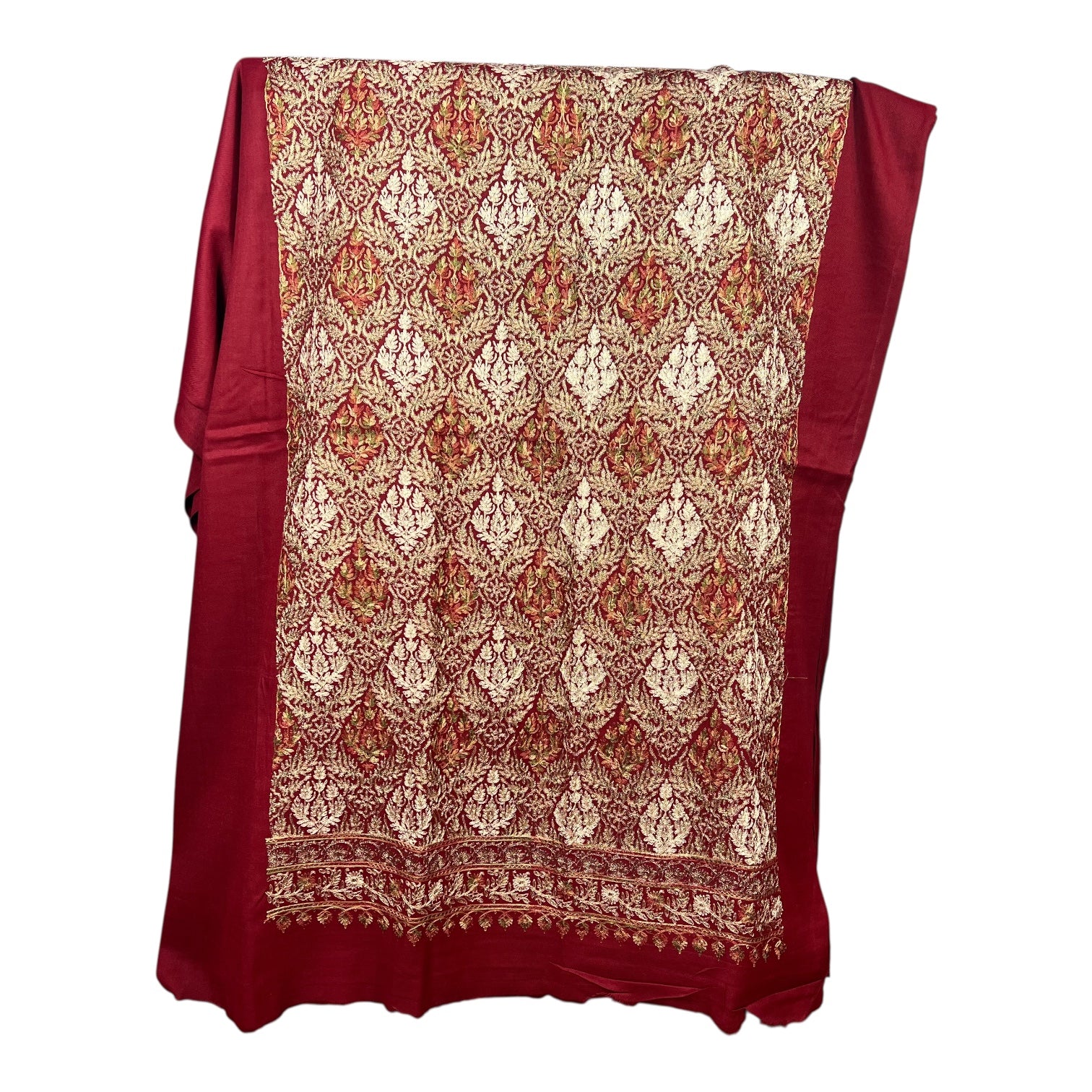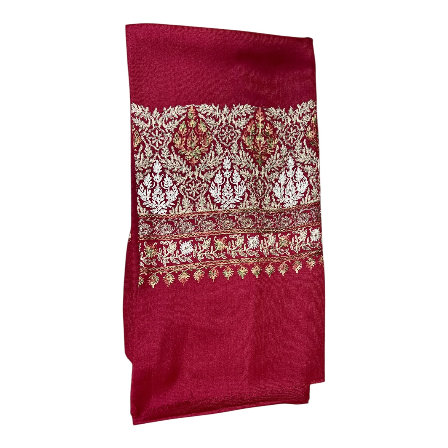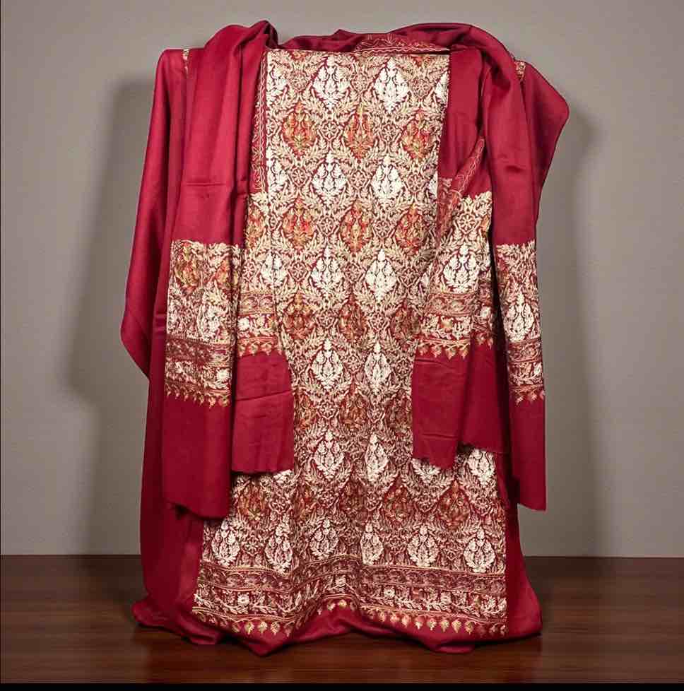 The shirt features full front embroidery, side embroidered panels, and embroidered sleeves. The matching pashmina shawl is also beautifully embroidered, giving it a graceful drape perfect for winter gatherings. The plain trouser/shalwarcompletes the suit with a balanced and classy finish.