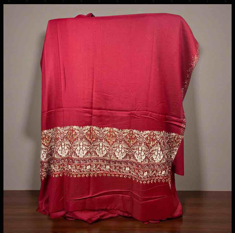 This luxury 3-piece pashmina suit comes with an embroidered front, an embroidered shawl, a side & border embroidered shirt, embroidered sleeves, and a plain trouser/shalwar. Soft winter fabric, premium finishing, and perfect for formal events, parties, and wedding season.