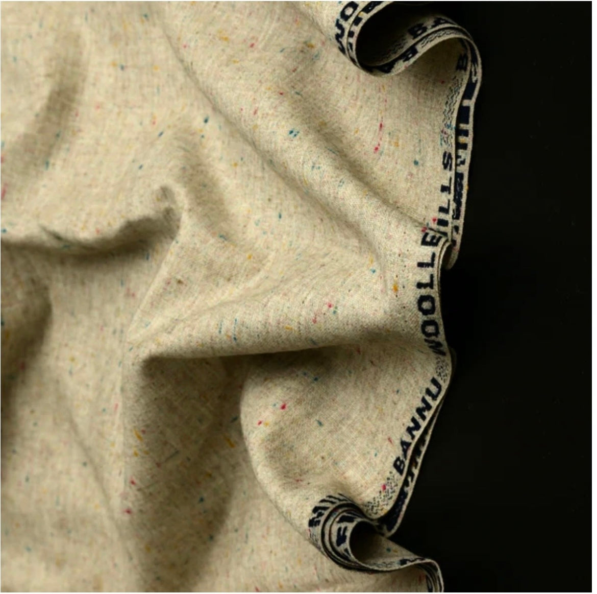 Brighten your winter wardrobe with the authentic Bannu Woollen Donegal Fabric in a stunning Light Cream/Ivory Speckled finish. This exquisite material offers a rare combination of Donigal/Tweed style texture and sophisticated light color. It is recognized as one of the most expensive and reliable pure wool fabrics from the mills, upholding a legacy of quality and ensuring your investment endures.