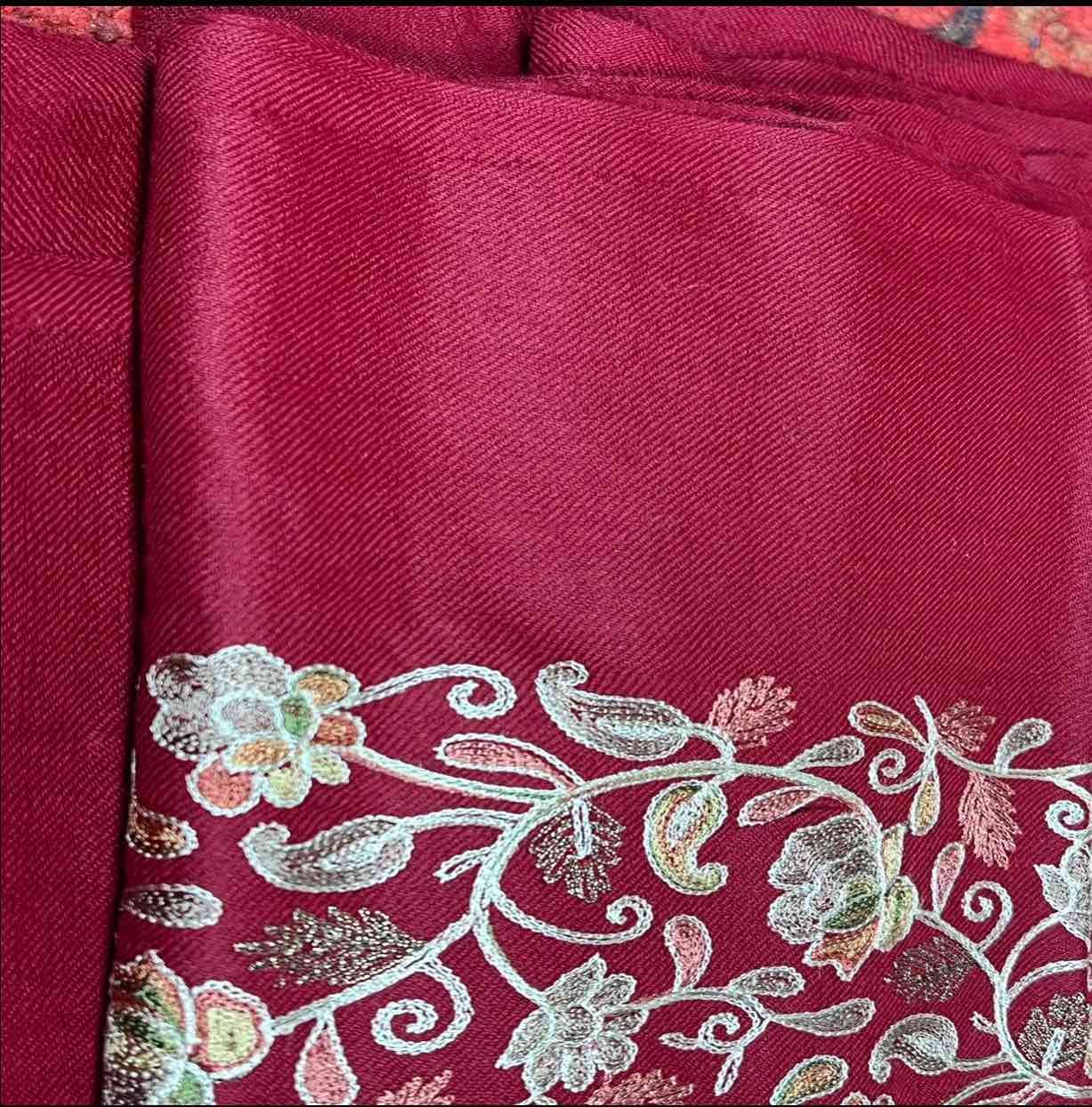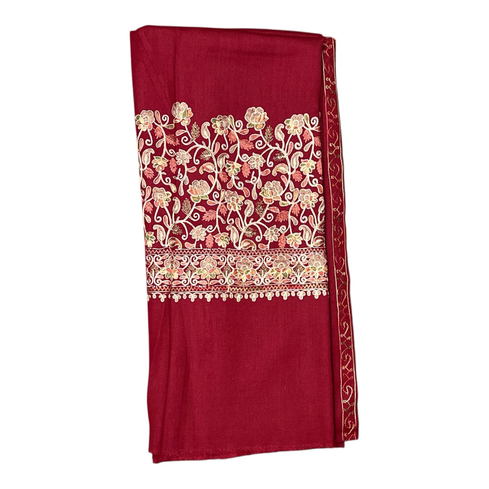 Premium Maroon Pashmina 3-Piece Ladies Suit – Full Front Embroidery & Side-Embroidered Shawl | Winter Collection
